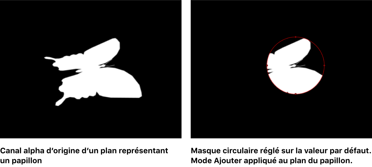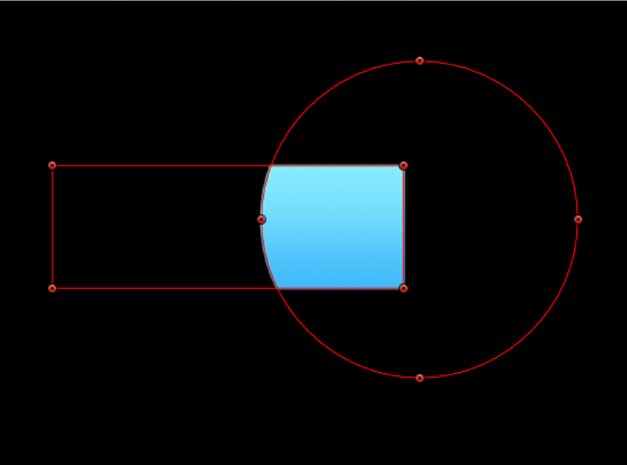 Croiser : affiche des pixels uniquement dans les régions où des masques se chevauchent. Dans l’exemple suivant, seules les zones des masques rectangulaire et circulaire qui se chevauchent sont visibles.