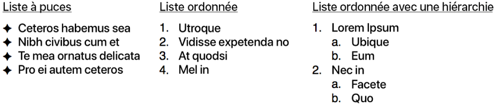 Remarque : les styles de liste incluent seulement la mise en forme définie à l’aide des commandes « Modifier le style de liste » de la section « Puces et listes ».