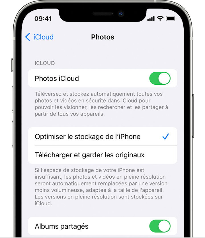 Vous avez besoin d’économiser de l’espace sur votre appareil? Activer Optimiser le stockage. Lorsque vous effectuez cette opération, iCloud Photos conserve vos photos et vidéos dans leur version originale haute résolution, tandis que des versions optimisées pour économiser de l’espace sont conservées sur votre appareil. Votre bibliothèque sera également optimisée lorsque vous avez besoin d’espace, en commençant par les photos et les vidéos auxquelles vous accédez le moins, et vous pouvez télécharger des originaux par l’entremise d’une connexion Wi-Fi ou cellulaire.
