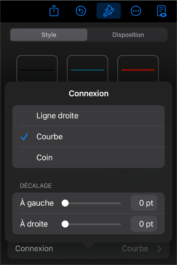 .Dans l’onglet Style, touchez Connexion, puis touchez Courbe ou Coin.