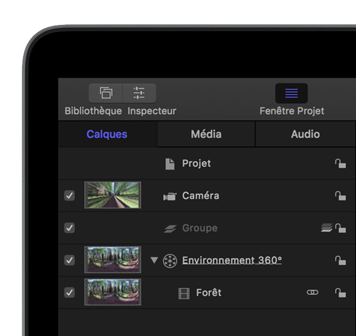 Dans votre projet actuel, ajoutez un environnement 360º en bas de la liste Calques. Ensuite, ajoutez des médias ou des effets 360º au calque Environnement 360º. Si votre projet ne contient pas de caméra, choisissez Objet > Nouvelle caméra, puis définissez-la en tant que Point de vue dans l’inspecteur de caméra.