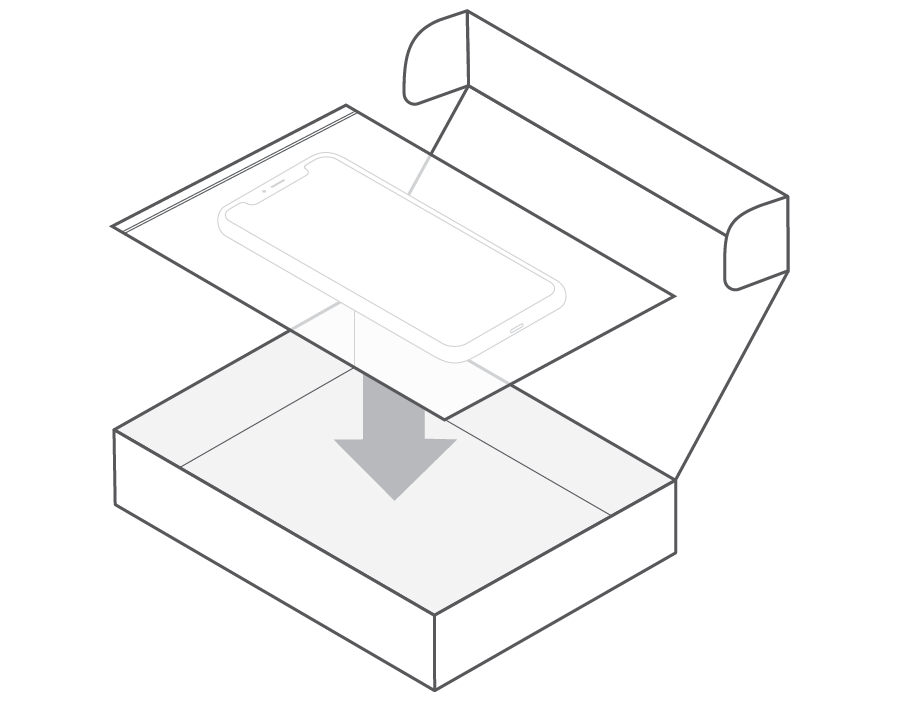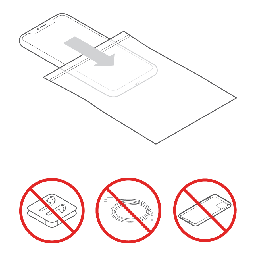 - Placez votre iPhone dans le sachet. N’incluez pas le casque stéréo, le câble USB, l’adaptateur secteur, ni aucun autre accessoire. Si vous ajoutez des éléments supplémentaires dans la boîte, nous ne pourrons pas vous les renvoyer.