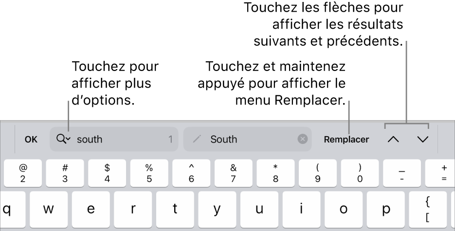 , puis touchez « Rechercher et remplacer ».Saisissez un mot ou une phrase dans le champ de texte de gauche.