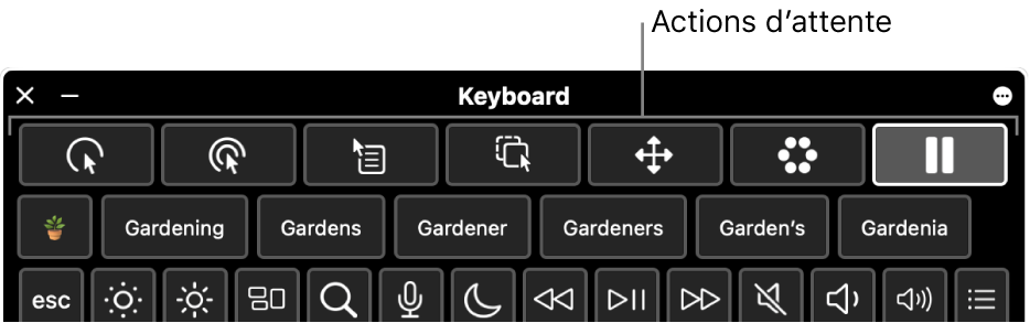 Si vous utilisez Attente avec le clavier d’accessibilité sur votre Mac, vous pouvez utiliser le menu Options pour passer rapidement d’une action d’attente à une autre. Lorsque vous sélectionnez une action dans le menu Options, elle n’est utilisée qu’une fois (autrement dit, elle n’est pas réutilisée automatiquement).