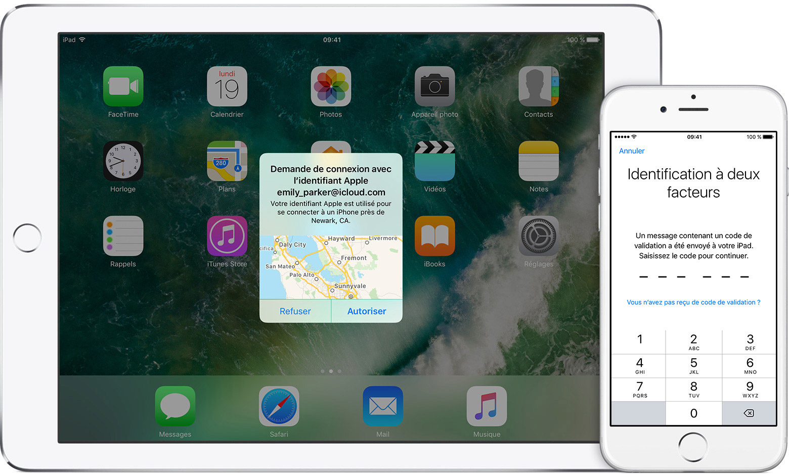 Un code d’activation temporaire est transmis à votre appareil de confiance ou numéro de téléphone lorsque vous vous connectez à un nouvel appareil ou navigateur à l’aide de votre identifiant Apple. Vous pouvez également obtenir un code de vérification via la section Réglages de votre appareil de confiance.
