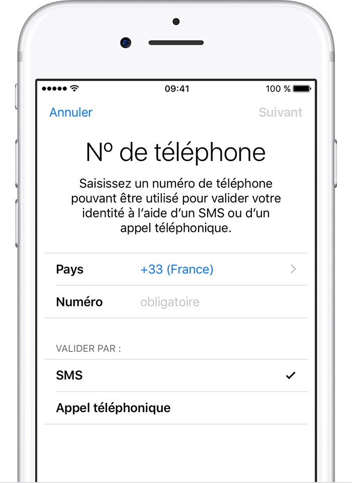 Lorsque vous touchez Suivant, Apple envoie un code de validation au numéro de téléphone que vous avez fourni.