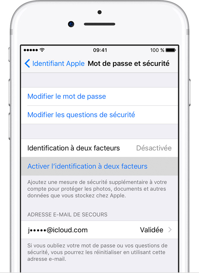 Votre mot de passe seul n’étant pas suffisant pour accéder à votre compte, l’identification à deux facteurs renforce considérablement la sécurité de votre identifiant Apple et de toutes les informations personnelles que vous stockez auprès d’Apple.