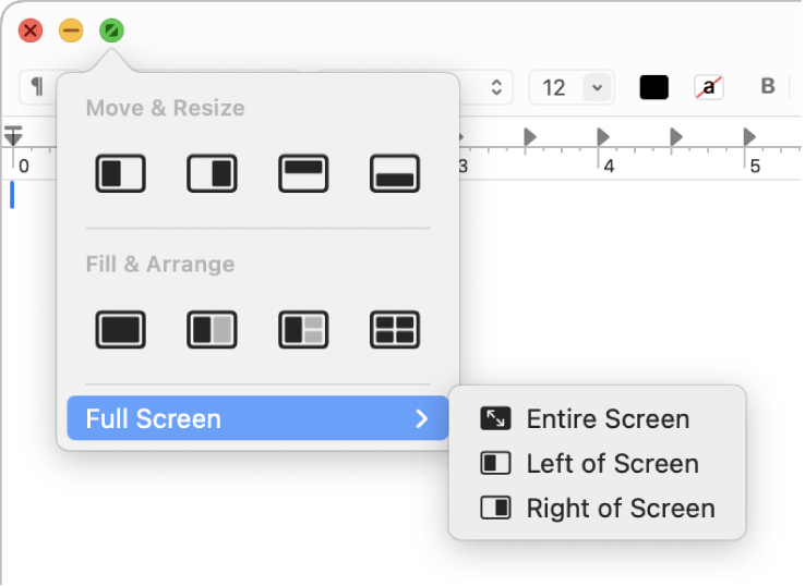 Placez le pointeur sur le bouton vert en haut à gauche de la fenêtre, puis choisissez Plein écran > Tout l’écran.