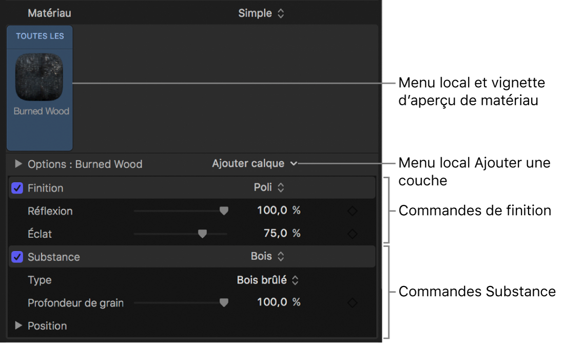 Vous pouvez régler les commandes de paramètres de chacun de ces calques de matériau pour modifier la texture appliquée à votre texte 3D. Vous trouverez ci-dessous la liste complète des commandes disponibles pour chaque type de calque de matériau :