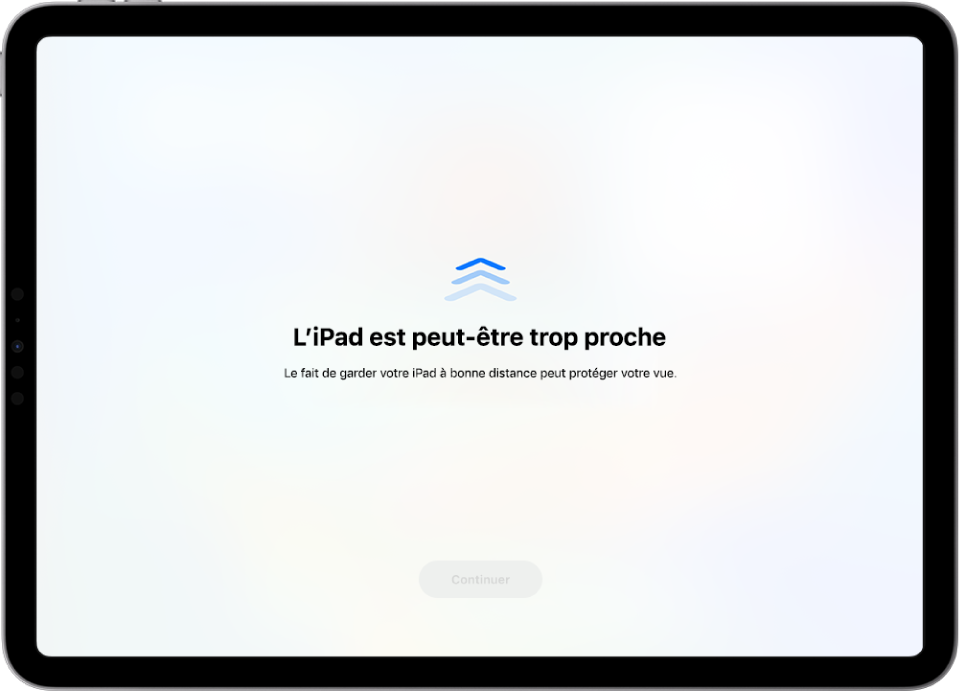 Si vous tenez l’appareil trop près de votre visage pendant une période prolongée après avoir activé « Distance de l’écran », la fonctionnalité affiche une alerte qui occupe toute la surface de l’écran pour vous empêcher d’utiliser l’appareil. Une fois que l’iPad se trouve à plus de 30 cm de votre visage, vous pouvez toucher Continuer pour poursuivre ce que vous faisiez.