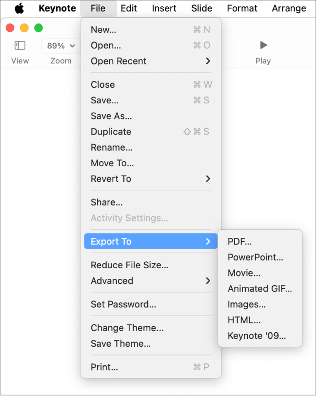 To save a copy of a Keynote presentation in another format, you export it in the new format. This is useful when you need to send the presentation to people who are using different software. Any changes made to the exported presentation don’t affect the original. Keynote also remembers the last export settings you used.