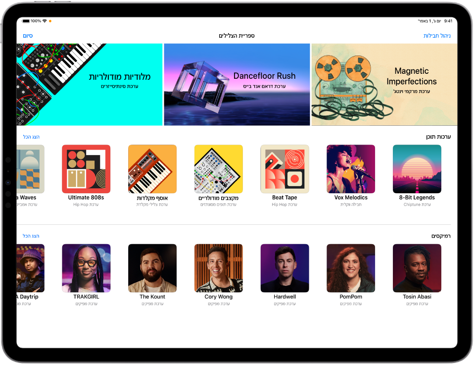 השתמש/י ב״ספריית הצלילים״ כדי להוריד ולנהל ערכות צלילים המכילות מאות לולאות, צלילים, ״כלים מבוססי-מגע״, מערכות תופים ועוד. GarageBand מעדכן אותך כשיש ערכות צלילים חדשות זמינות להורדה.