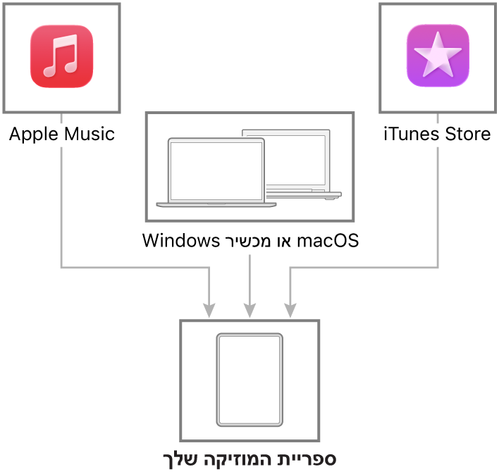 ניתן לחבר את ה‑Mac או מכשיר ה‑Windows כדי להעביר ולעדכן מוזיקה בין ה‑iPad והמכשיר שלך. כדי לסנכרן תוכן נתמך יש להפעיל את ״מוזיקה״ (ב‑macOS 10.15 ואילך) או ב‑iTunes (macOS 10.14 ומטה ומכשירי Windows).