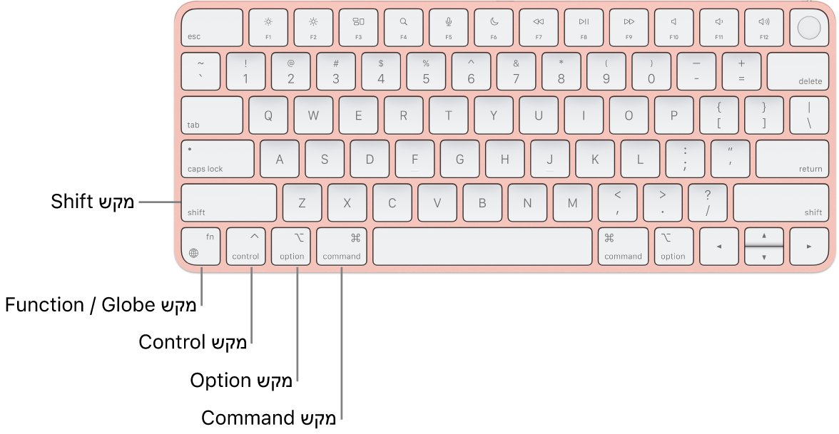 הערה: אם יש לך Magic Keyboard של Apple עם Touch ID ומשטח ספרות, המקש פונקציה/גלובוס ממוקם משמאל למקש Delete.