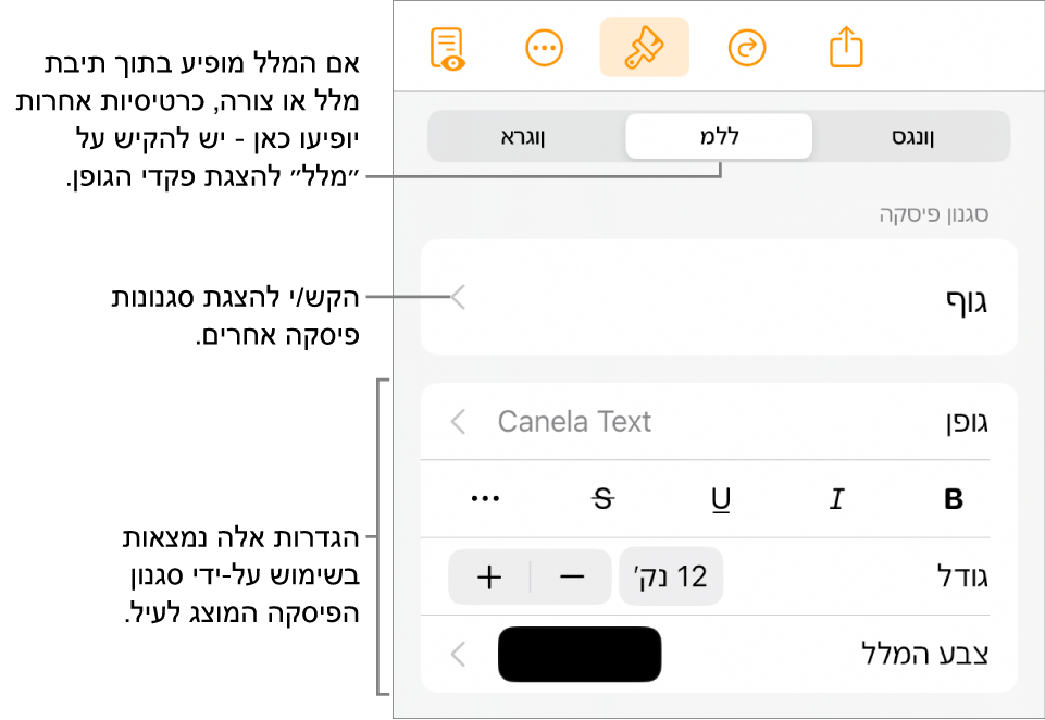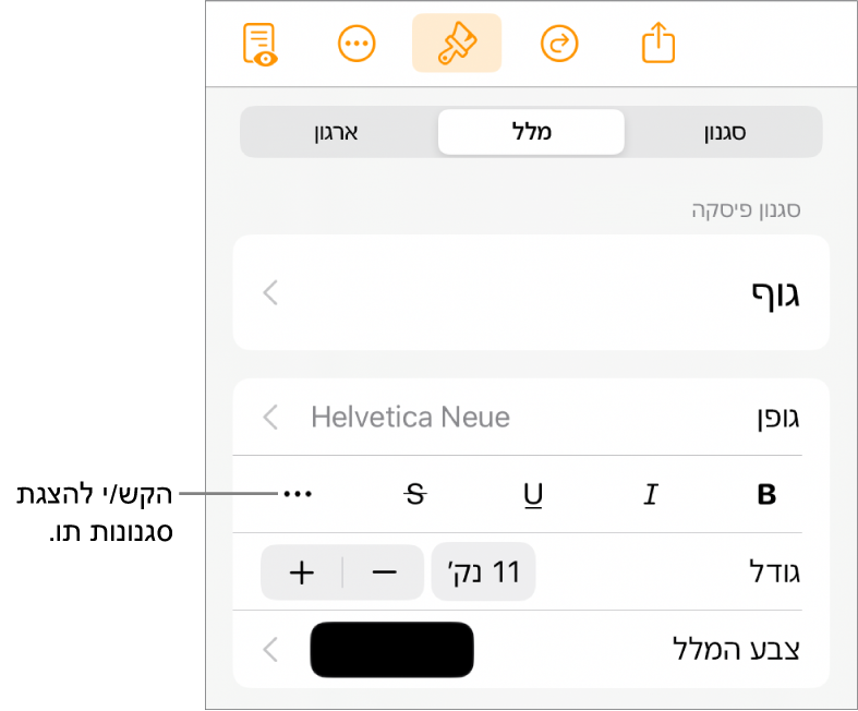מעל כלי הבקרה של גודל הגופן.לחלופין, אם שם של סגנון תו מופיע מתחת ל״צבע מלל״, אפשר להקיש על השם של סגנון התו.
