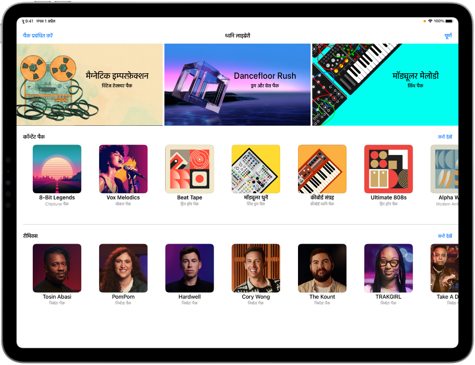सैकड़ों लूप, ध्वनियों, स्पर्श वाद्ययंत्रों, ड्रम किट इत्यादि वाले ध्वनि पैक डाउनलोड और प्रबंधित करने के लिए ध्वनि लाइब्रेरी का उपयोग करें। GarageBand से आप यह जान सकते हैं कि डाउनलोड के लिए नए ध्वनि पैक कब उपलब्ध होते हैं।