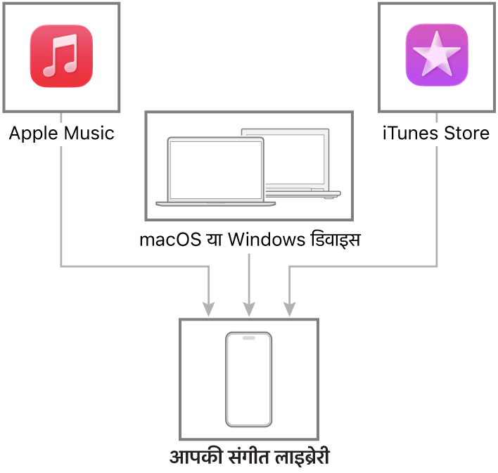 अपने iPhone और डिवाइस के बीच संगीत ट्रांसफ़र और अपडेट करने के लिए, अपने Mac या Windows डिवाइस कनेक्ट करें। समर्थित कॉन्टेंट सिंक करने के लिए, संगीत (macOS 10.15 या बाद के संस्करण) या iTunes (macOS 10.14 या इससे पहले के संस्करण और Windows डिवाइस) का इस्तेमाल करें।