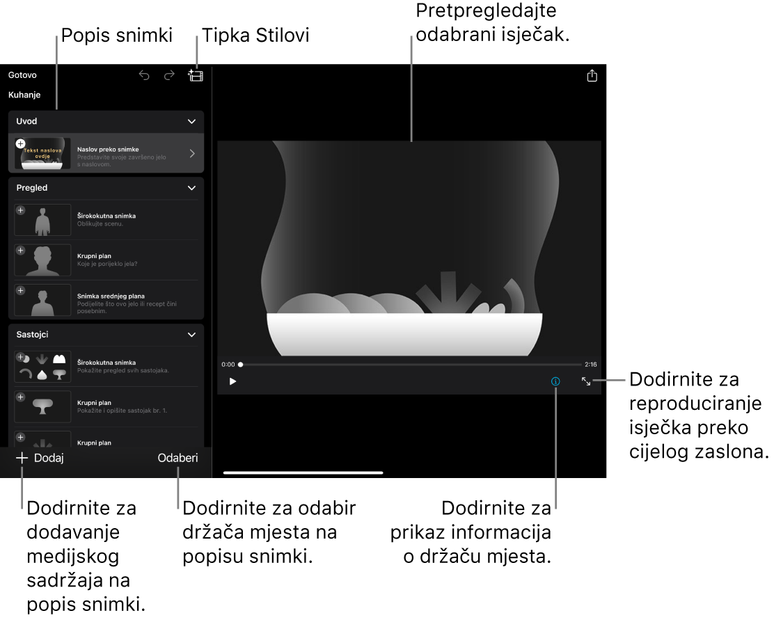 Knjige snimanja su predlošci videozapisa za izradu čestih vrsta videozapisa, poput uputa za kuhanje, ocjena proizvoda ili znanstvenih eksperimenata, pomoću vaših vlastitih videozapisa i fotografija. Nakon što izradite projekt knjige snimanja, možete ispuniti držače mjesta s video isječcima i fotografijama, prerasporediti isječke i urediti svaki isječak pojedinačno.