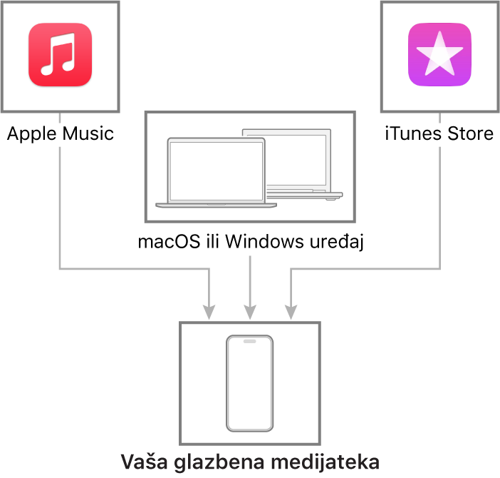 Uživajte u glazbi pohranjenoj na iPhoneu kao i u glazbi koju streamate s interneta. Glazbenu medijateku, svoju kolekciju pjesama i albuma, možete izgraditi na mnogo načina.