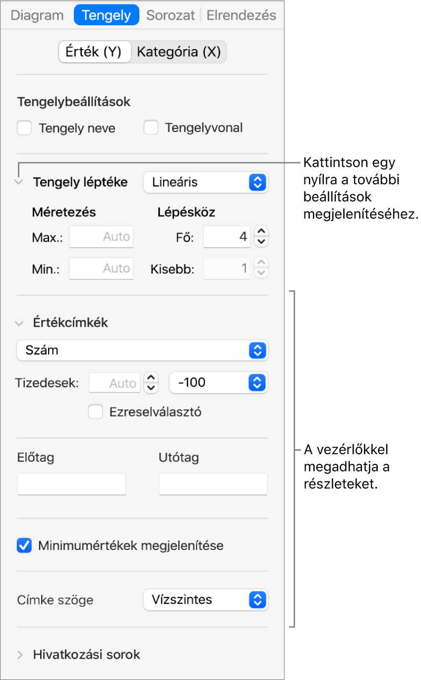 Az értéktengelyen lévő jelölések módosítása: Kattintson az oldalsáv teteje közelében lévő Érték (Y) gombra.