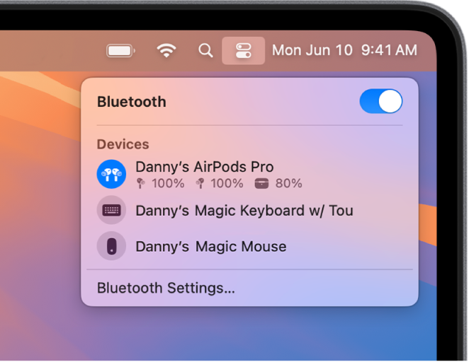 A Bluetooth® segítségével billentyűzetet, egeret, trackpadet, fejhallgatót és hangszórókat csatlakoztathat a Macjéhez. Egy másik megoldásként az AirPodst is használhatja a Mackel.