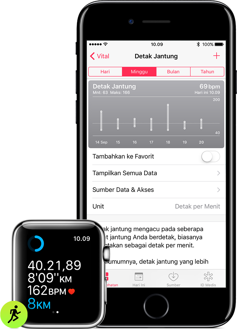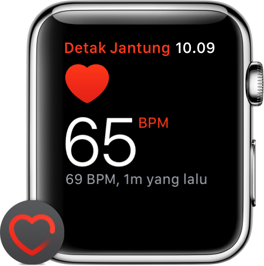 Detak jantung hanyalah salah satu faktor yang digunakan Apple Watch untuk mengukur aktivitas dan latihan Anda. Apple Watch akan memilih input yang paling sesuai untuk aktivitas tersebut, tergantung pada olahraga Anda. Misalnya, ketika Anda berlari dalam ruangan, Apple Watch juga menggunakan akselerometer. Ketika Anda bersepeda di luar ruangan, GPS digunakan di Apple Watch Series 2 atau di iPhone untuk Apple Watch (generasi ke-1). Dan bahkan ketika Anda sedang tidak melakukan olahraga khusus, Apple Watch akan melacak berapa banyak Anda bergerak setiap harinya. Jadi Apple Watch dapat memberi Anda informasi — dan motivasi — untuk meningkatkan kebugaran dan kesehatan Anda.