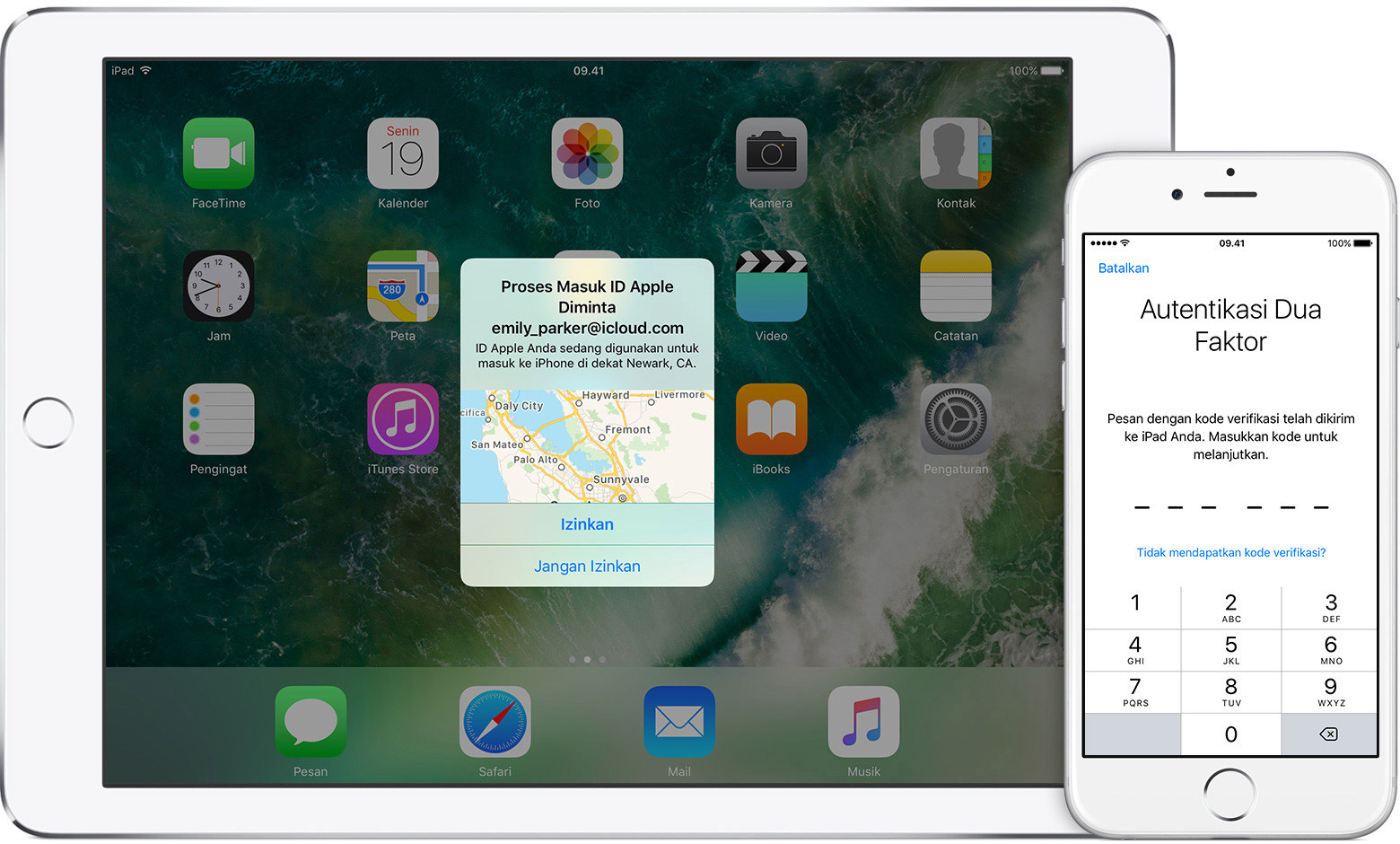 Dengan autentikasi dua faktor, akun hanya dapat diakses di perangkat yang Anda percaya, seperti iPhone, iPad, atau Mac. Ketika ingin masuk ke perangkat baru untuk pertama kali, Anda harus memberikan dua jenis informasi—kata sandi dan enam digit kode verifikasi yang ditampilkan secara otomatis di perangkat tepercaya Anda. Dengan memasukkan kode, Anda memverifikasi bahwa Anda memercayai perangkat baru tersebut. Misalnya, jika Anda memiliki iPhone dan masuk ke akun Anda untuk pertama kali di Mac yang baru dibeli, Anda akan diminta memasukkan kata sandi dan kode verifikasi yang ditampilkan secara otomatis di iPhone.