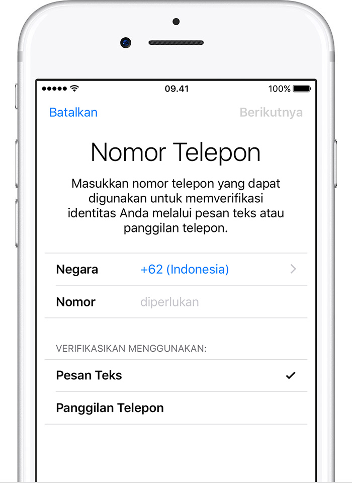 Autentikasi dua faktor saat ini tersedia bagi pengguna iCloud dengan setidaknya satu perangkat yang menggunakan iOS 9 atau OS X El Capitan atau versi lebih baru. Pelajari lebih lanjut.
