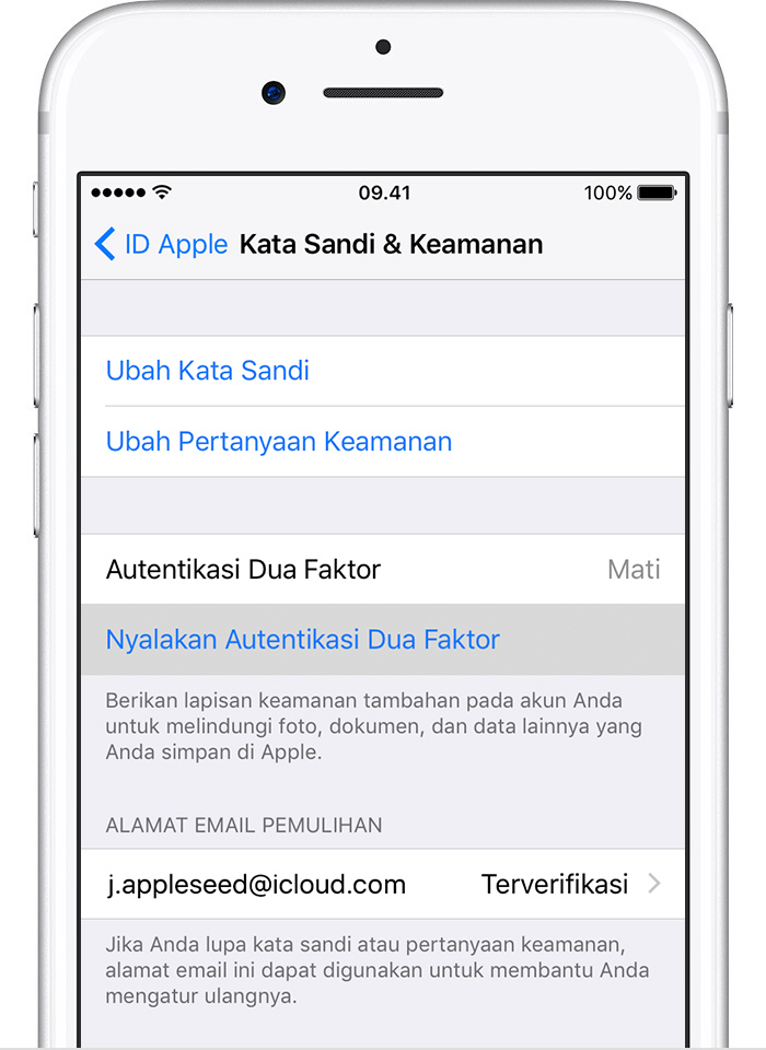 Anda dapat mengikuti langkah-langkah berikut di iPhone, iPad, atau iPod touch untuk menyalakan autentikasi dua faktor.