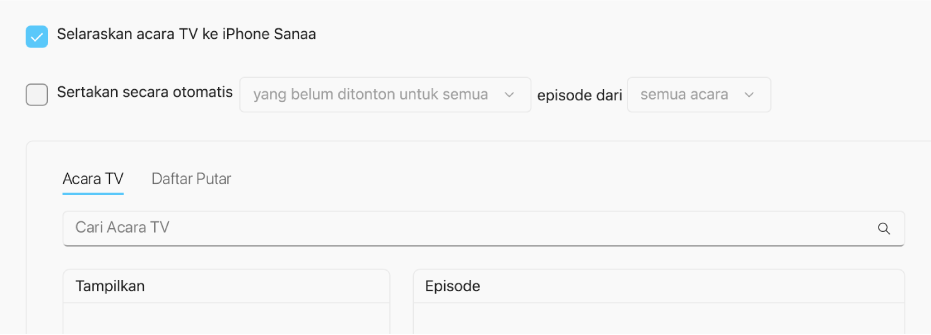 Untuk menyelaraskan acara TV pilihan, pilih kotak centang “Sertakan secara otomatis”, lalu gunakan menu pop-up untuk memilih jumlah acara TV terbaru, terbaru yang belum ditonton, atau terlama yang belum ditonton. Lalu pilih untuk menyertakan semua acara atau acara yang dipilih dari menu pop-up episode.