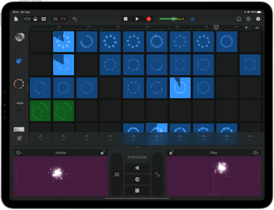 Gunakan Live Loops untuk membuat musik elektronik hanya dengan mengetuk sel dan kolom di grid untuk memicu loop musik. Anda dapat membuat aransemen Anda sendiri, lalu mengimprovisasi dan merekam penampilan Live Loops.