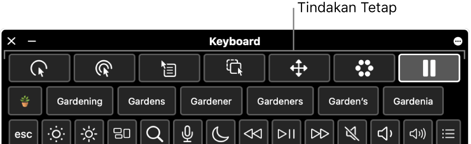 Jika Anda menggunakan Tetap dengan Papan Ketik Aksesibilitas di Mac, Anda dapat mengakses tindakan tetap dari Papan Ketik Aksesibilitas dan panel khusus atau dari menu status Tetap di bar menu, tergantung cara Anda mengatur pilihan Tetap.
