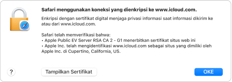 Saat Anda mengunjungi situs web yang dienkripsi—misalnya, untuk melakukan perbankan online—Safari akan memeriksa apakah sertifikat situs webnya sah. Jika tidak sah, Anda mendapatkan pesan peringatan.