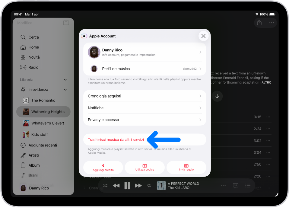 Una volta sottoscritto l’abbonamento, puoi facilmente trasferire su Apple Music la tua musica da altri servizi musicali. Tocca l’icona del tuo profilo nell’angolo in basso a sinistra, quindi tocca “Trasferisci musica da altri servizi”. Segui le istruzioni sullo schermo per trasferire la libreria o le playlist che hai già.