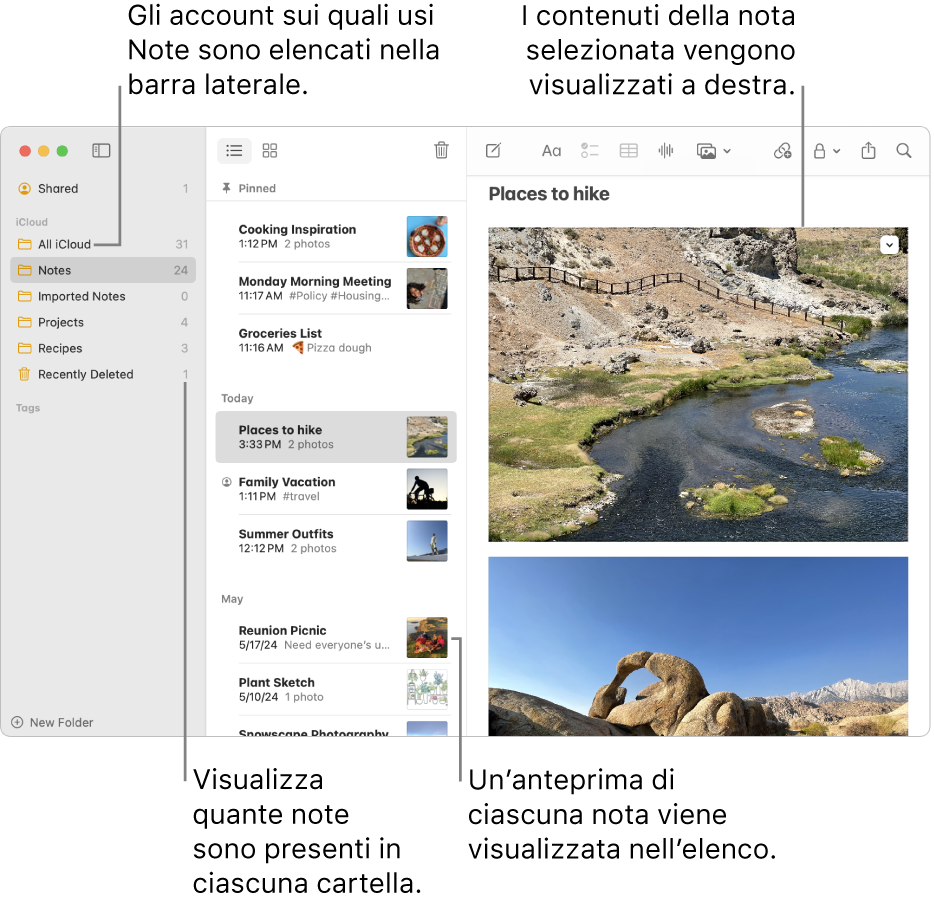 Le note nella cartella selezionata vengono visualizzate a destra dell’elenco delle cartelle. Per modificare l’ordine di visualizzazione delle note, consulta Scegliere un ordinamento di default per tutte le note.
