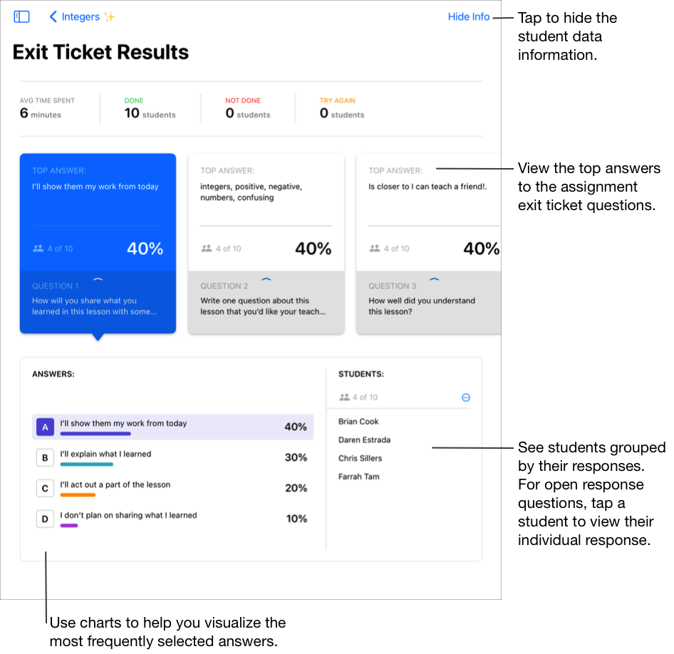 Usa la visualizzazione dei risultati scheda finale in Schoolwork per visualizzare i risultati dei quiz per un’intera classe, includi le risposte migliori e i grafici per vedere le risposte aperte e le opzioni selezionate più frequentemente. Con queste informazioni, puoi determinare il livello di apprendimento dei tuoi studenti e come sono raggruppati in base alle risposte alle domande della scheda finale.