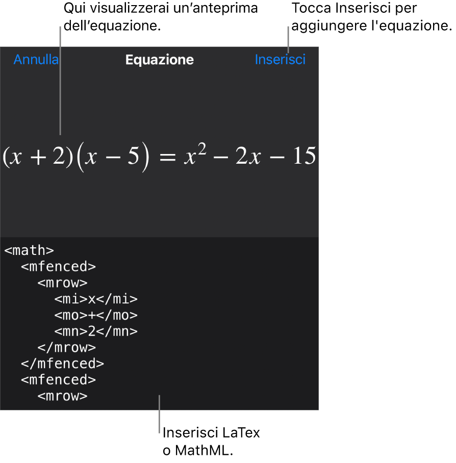 Puoi aggiungere espressioni ed equazioni matematiche come oggetti mobili su una diapositiva. Per aggiungere un’equazione, devi scriverla nella finestra di dialogo delle equazioni di Keynote utilizzando comandi LaTeX o elementi MathML e poi inserirla nella presentazione.