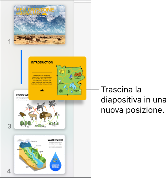 Trascina la diapositiva che desideri spostare in una nuova posizione nel navigatore diapositive, nella struttura della presentazione o nella vista “Tavolo luminoso”.