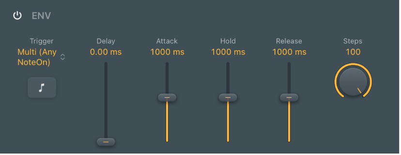 Hold slider and field: Set the sustain level and duration. Ranges from 0 to 10 seconds.