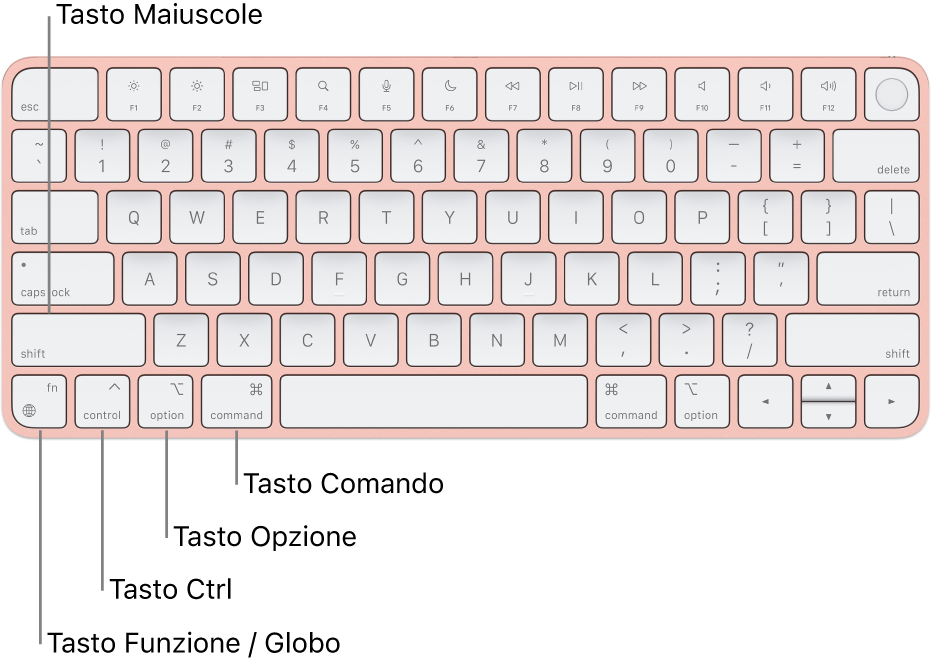Nota: Se hai una tastiera Apple Magic Keyboard con Touch ID e tastierino numerico, il tasto Funzione/Globo è posizionato a destra del tasto Elimina.