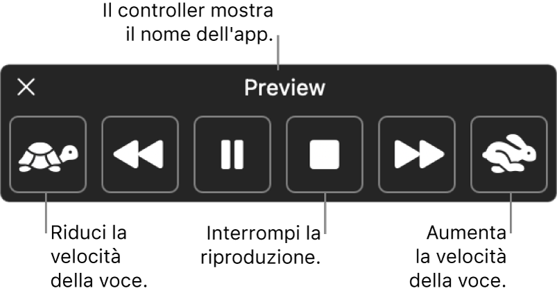 Il controller è particolarmente utile quando il Mac legge lunghe porzioni di testo. Puoi utilizzare il controller per fare in modo che il can Mac inizi a leggere ad alta voce, per interrompere la lettura, per modificare la velocità di lettura, andare avanti o indietro e molto altro.