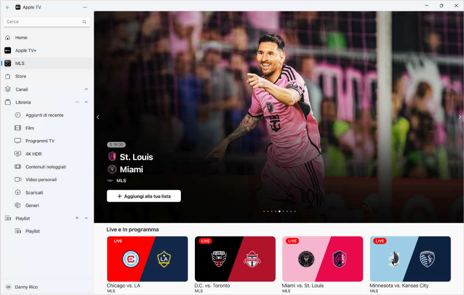 Il pannello MLS nell’app Apple TV ti consente di accedere a tutti gli eventi della Major League Soccer quando ti abboni a MLS Season Pass.