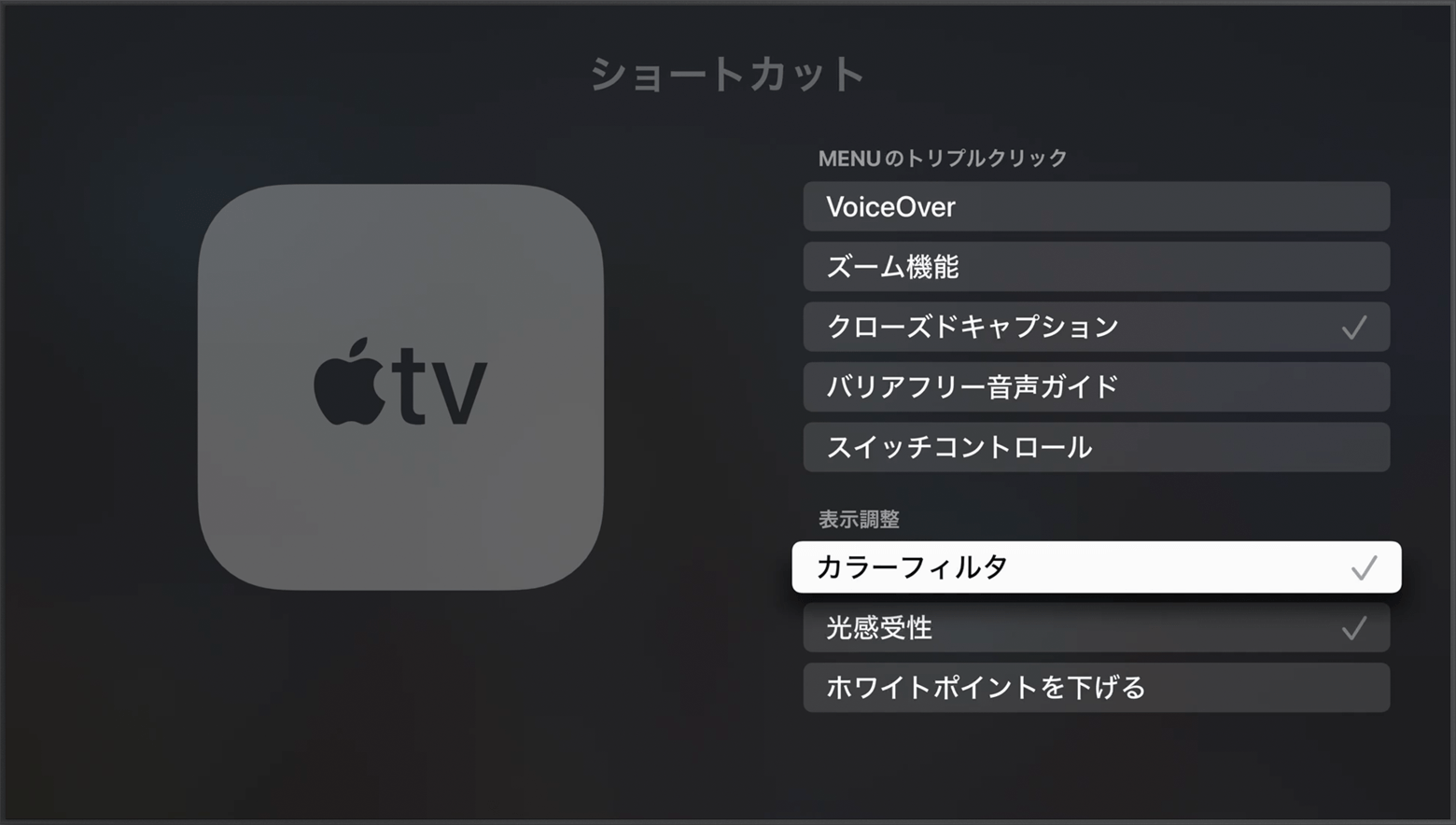 Apple TV 4K または Apple TV HD で視覚支援機能 (「カラーフィルタ」「ホワイトポイントを下げる」など) を使う方法をご案内します。