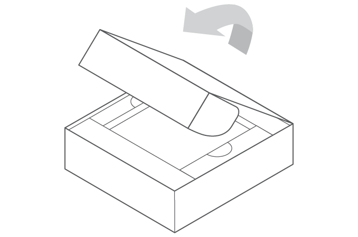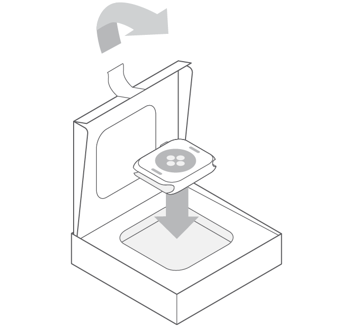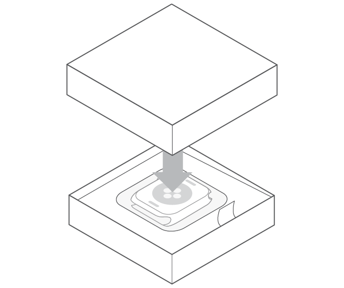 - Apple Watch を白い箱の中に入れます。バンド、リンクブレスレット、その他のアクセサリは配達員には渡さず、ご自分で保管しておいてください。