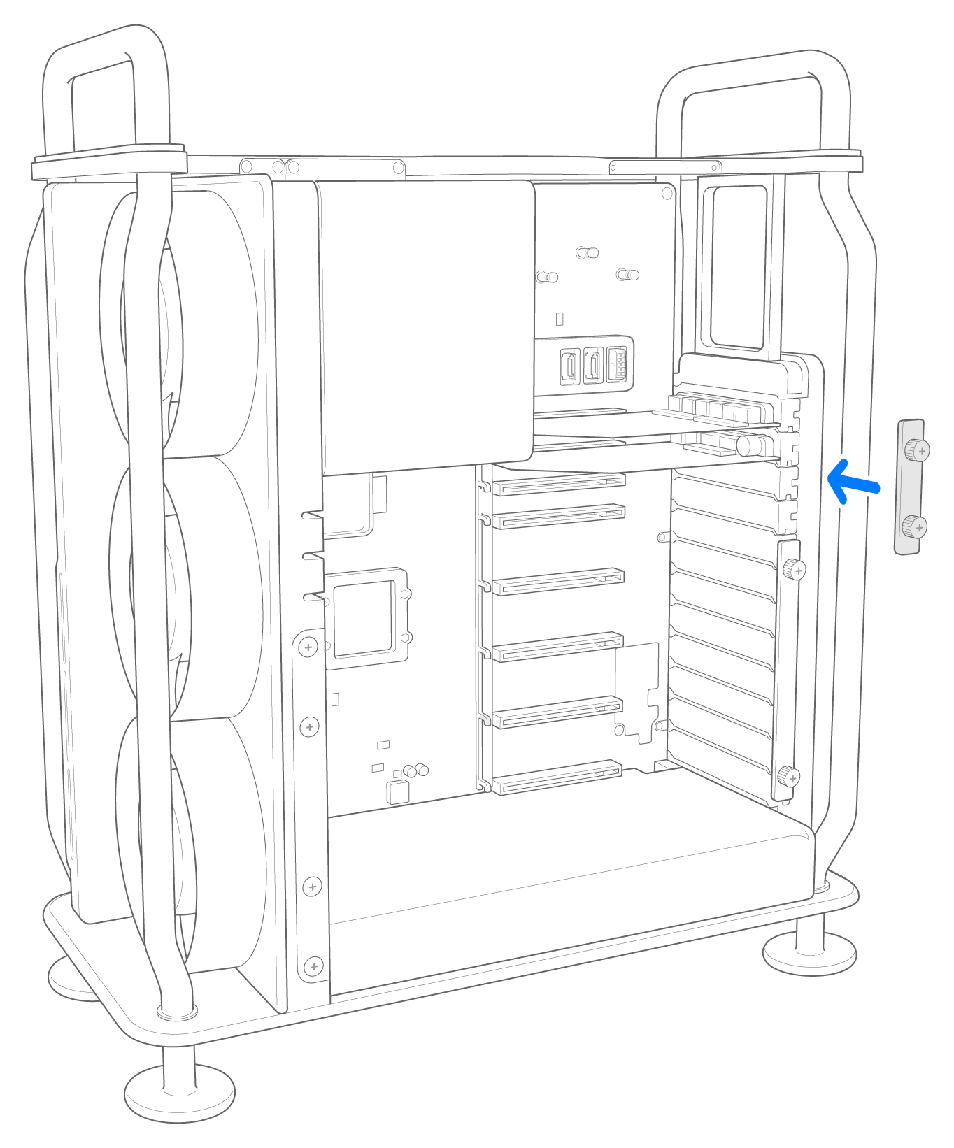 - 筐体を慎重に Mac Pro の上からかぶせます。回路基板には触れないように注意してください。