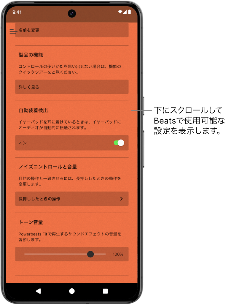 デバイス画面でスクロールして、Beatsで使用可能な設定を表示します。
