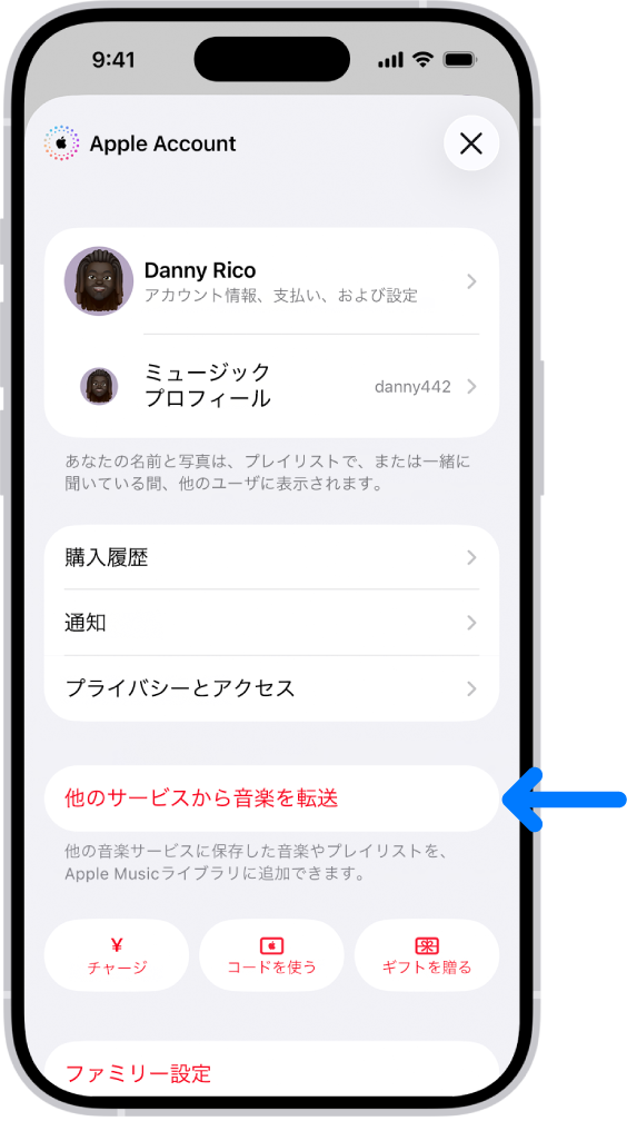 サブスクリプションに登録すると、ほかのミュージックサービスからApple Musicに簡単にミュージックを持ってくることができます。右上隅にあるプロフィールアイコンをタップしてから、「その他のサービスからミュージックを転送」をタップします。画面に表示される指示に従って、既存のライブラリやプレイリストを転送します。