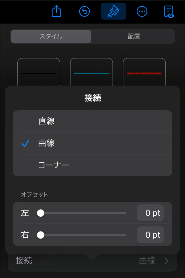 をタップします。「スタイル」タブで、「接続」をタップしてから「カーブ」または「コーナー」をタップします。