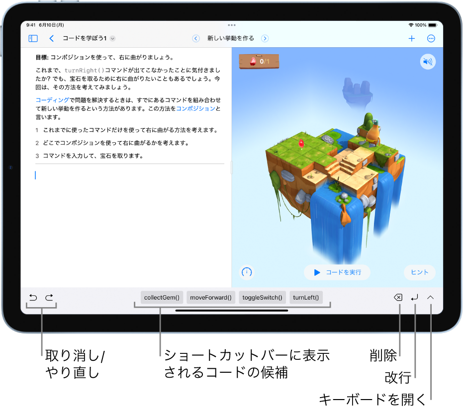 Swift Playgroundの一部のプレイグラウンドブックでは、ショートカットバー(またはショートカットリスト)のコードの候補とコントロールを使って、素早くコマンドを挿入したり、コードを削除したり、改行したりできます。例えば、(「その他のプレイグラウンド」画面の一番上にある)「コーディングを始めよう」プレイグラウンドのコーディング領域をタップすると、コーディング領域の下(またはキーボードの上部)にショートカットが表示されます。
