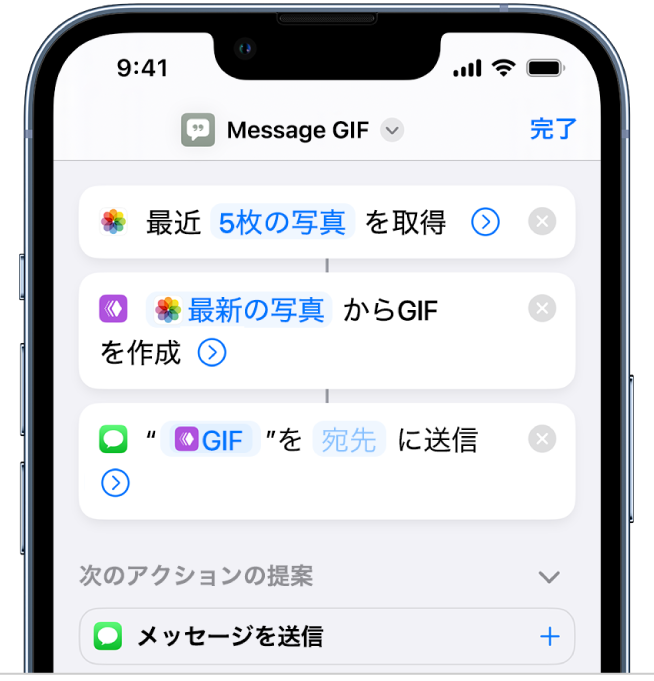 アクションは、ショートカットの構成要素で、タスク内の1つの手順のことです。複数のアクションから組み合わせて、Appleデバイス上のAppやコンテンツだけでなく、インターネット上のコンテンツやサービスを操作するショートカットを作成できます。各ショートカットは1つ以上のアクションで構成されます。